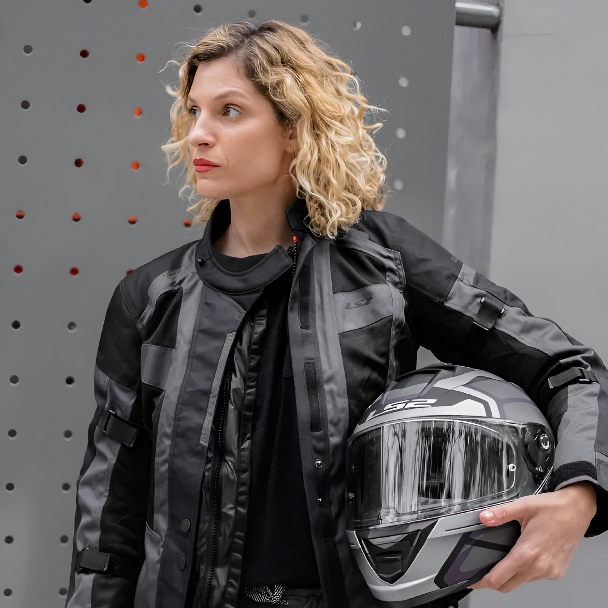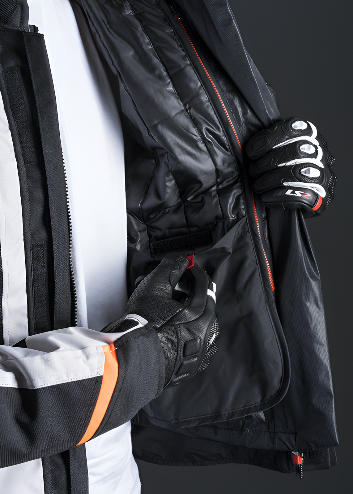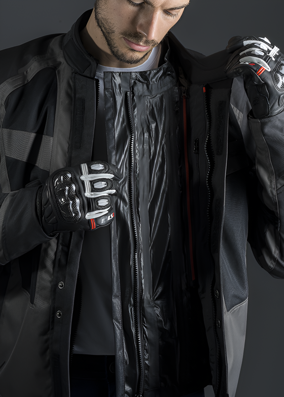 Cómoda chaqueta touring con forros térmicos e impermeables desmontables, ideal para todas las estaciones del año. Paneles de ventilación en pecho, espalda y brazos. Brazos ajustables. Protecciones desmontables en hombros y codos.
