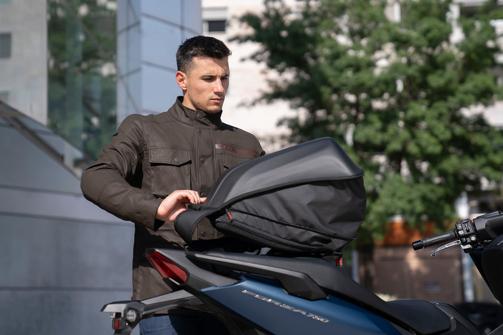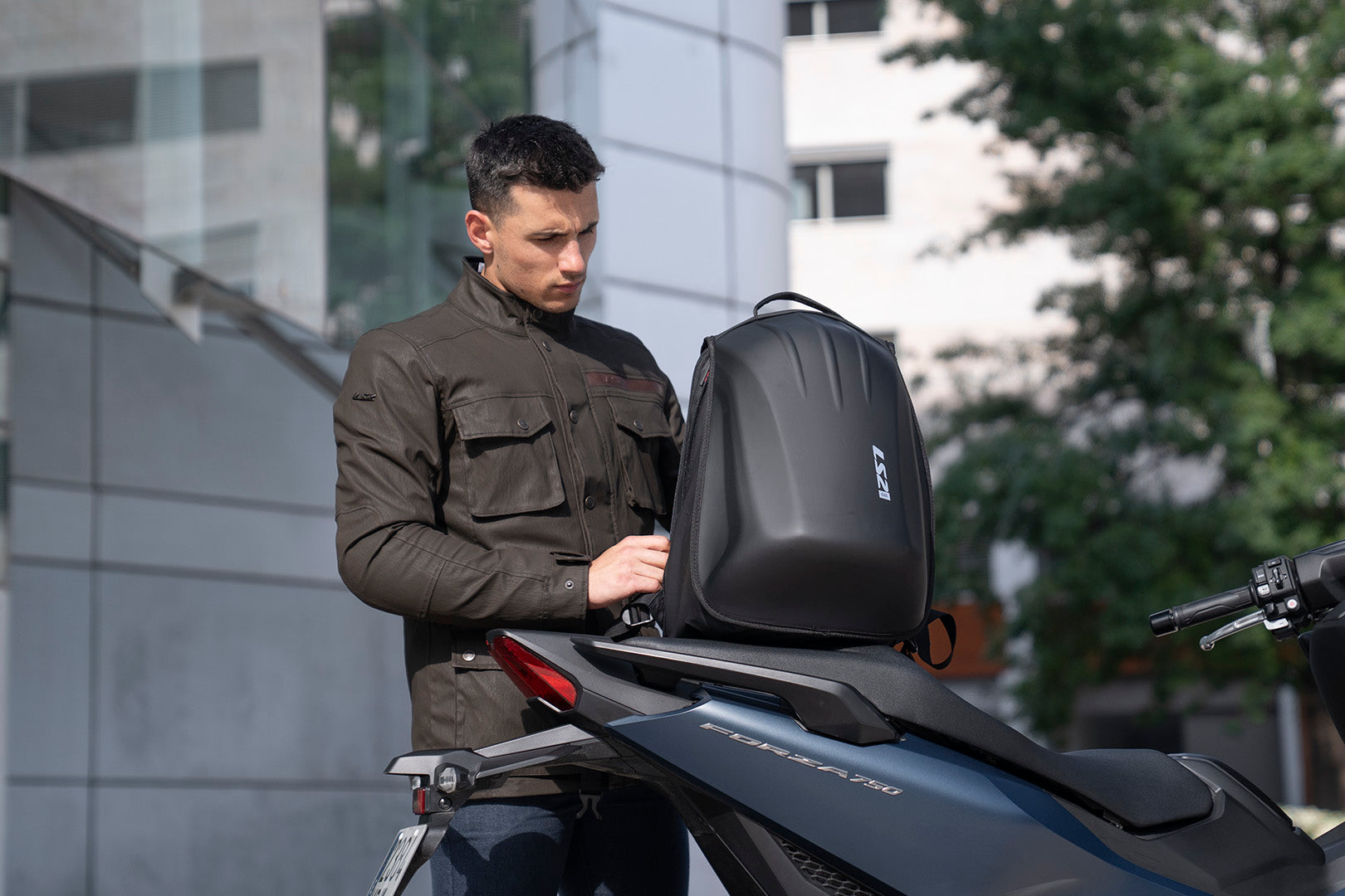Mochila aerodinámica con capa exterior rígida e hidrorrepelente y capacidad de 25 L. Incluye un compartimento expandible para casco integral y un bolsillo acolchado para portátil con sujeción segura.